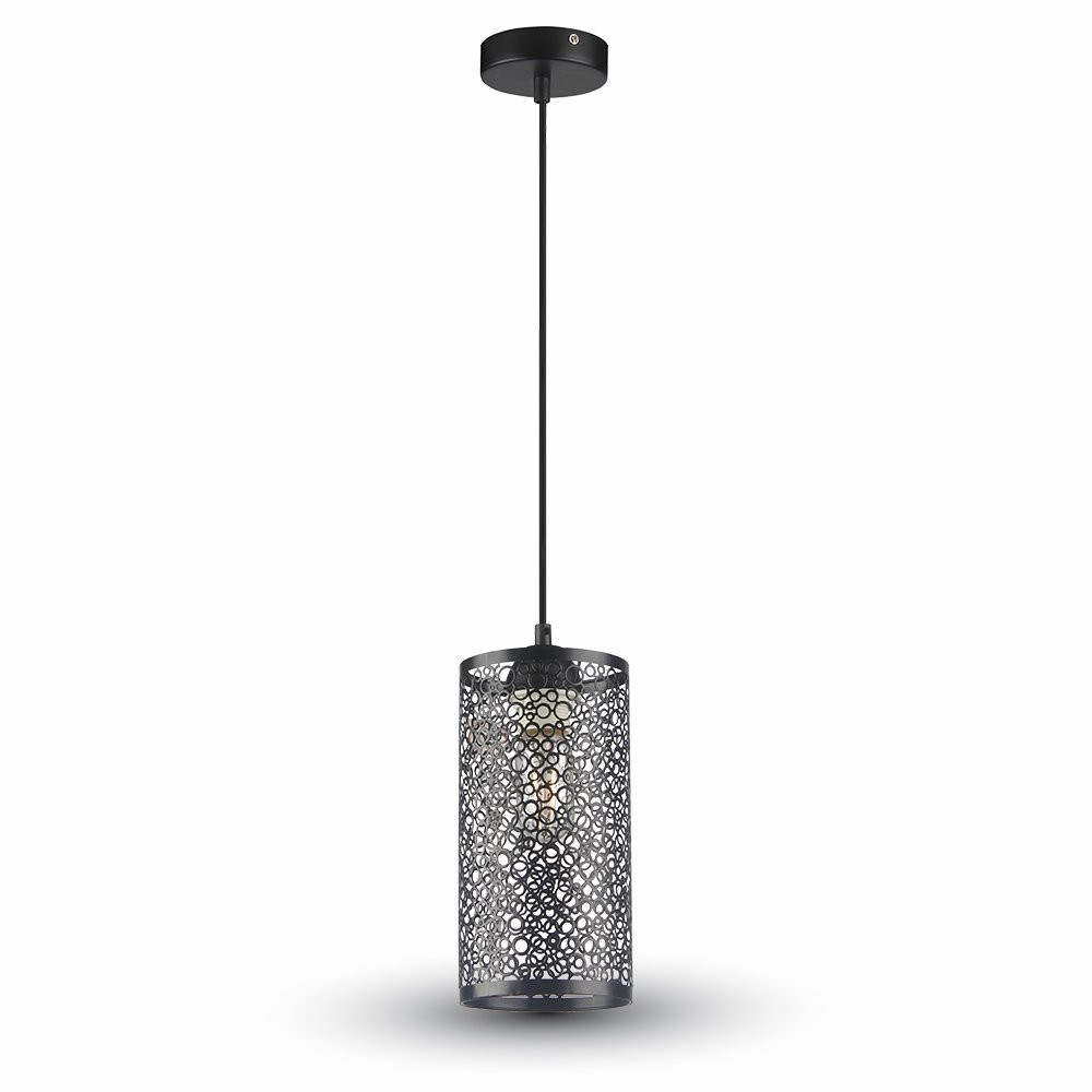 Lampadario V-Tac VT-7131-MB compatibile con lampadine E27. La campana è realizzata in metallo satinato, di forma cilindrica con una trama di cerchi contigui. Il portalampada (per 1 lampadina con attacco E27), è a scomparsa all’interno della campana, mentre il cavo è in gomma. Lampadario molto semplice da installare grazie alla connessione tramite morsetti a vite; inclusa piastra di fissaggio e viti. Adatto ad un uso interno, può essere abbinato ad una grandissima varietà di lampadine per creare atmosfere ogni volta differenti.