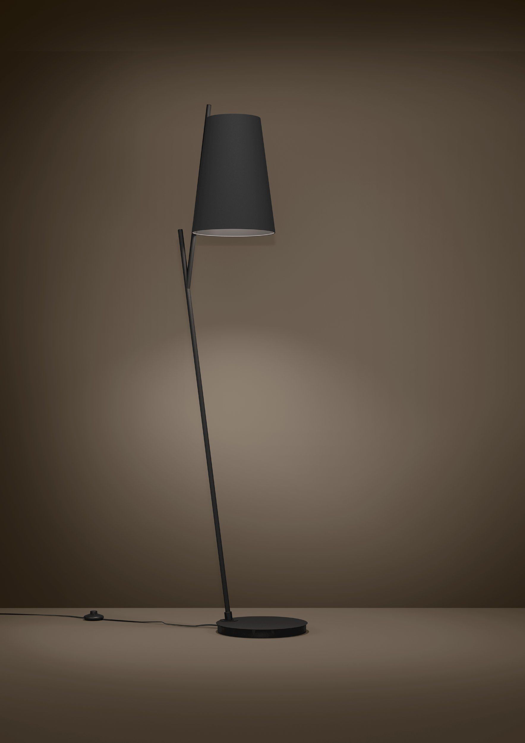 La piantana è composta da una delicata base in metallo nero e da un grande paralume conico in stoffa nera con interno nero rivestito di pellicola trasparente. Può essere accesa e spenta tramite interruttore a pedale presente sul cavo. Questa piantana retrò chic anni 60 si armonizza in particolare con arredamenti moderni dallo stile minimalista in qualunque ambiente, come la camera da letto, il soggiorno o la sala da pranzo. La lampadina, prevista con attacco E27, non è inclusa.