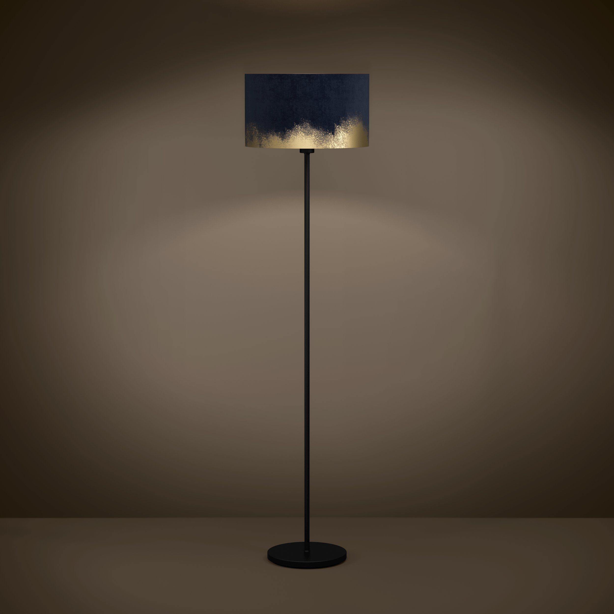 La piantana è composta da un paralume rotondo in velluto blu scuro con sfumature dorate dipinte a mano. Il paralume in velluto è corredato di un interno nero rivestito con pellicola trasparente e di una base nera in metallo ed è caratterizzata da un look elegante con fascino retrò. È possibile accendere e spegnere la lampada comodamente tramite un interruttore a pedale presente sul cavo. Si armonizza con tendenze di arredamento moderne offrendo un’elegante illuminazione in ogni ambiente, che sia nella camera da letto, nel soggiorno o nella sala da pranzo. La lampadina non è inclusa nella consegna. Per la lampada è adatta qualsiasi lampadina con attacco E27.