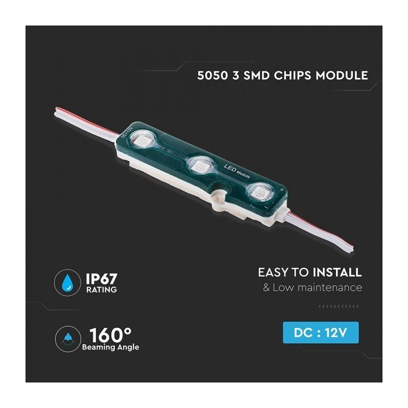 V-Tac VT-50503 modulo monocolore composto da 3 LED SMD 5050 con potenza totale di 0,72W e flusso luminoso complessivo di 66 lm. Realizzato in ABS e PCB, ha un fascio luminoso di 160° ed un rapporto di 91 lm/W. Grazie al suo grado di protezione IP67 è idoneo sia ad un uso domestico che industriale, ed è impiegabile anche nell’illuminazione architettonica di interni ed esterni. Date le ridotte dimensioni, è inoltre possibile utilizzarlo per insegne pubblicitarie o di segnalazione di qualsiasi misura e spessore. Il fascio luminoso diffuso consente una distribuzione omogenea della luce, mentre il biadesivo applicato sul retro rende il modulo di facile installazione. Il collegamento tramite cavi a saldare permette di alimentare tutti i moduli da un’unica fonte. Per il funzionamento è necessario un alimentatore 12V a corrente diretta proporzionato all’assorbimento totale di potenza di tutti i moduli collegati.