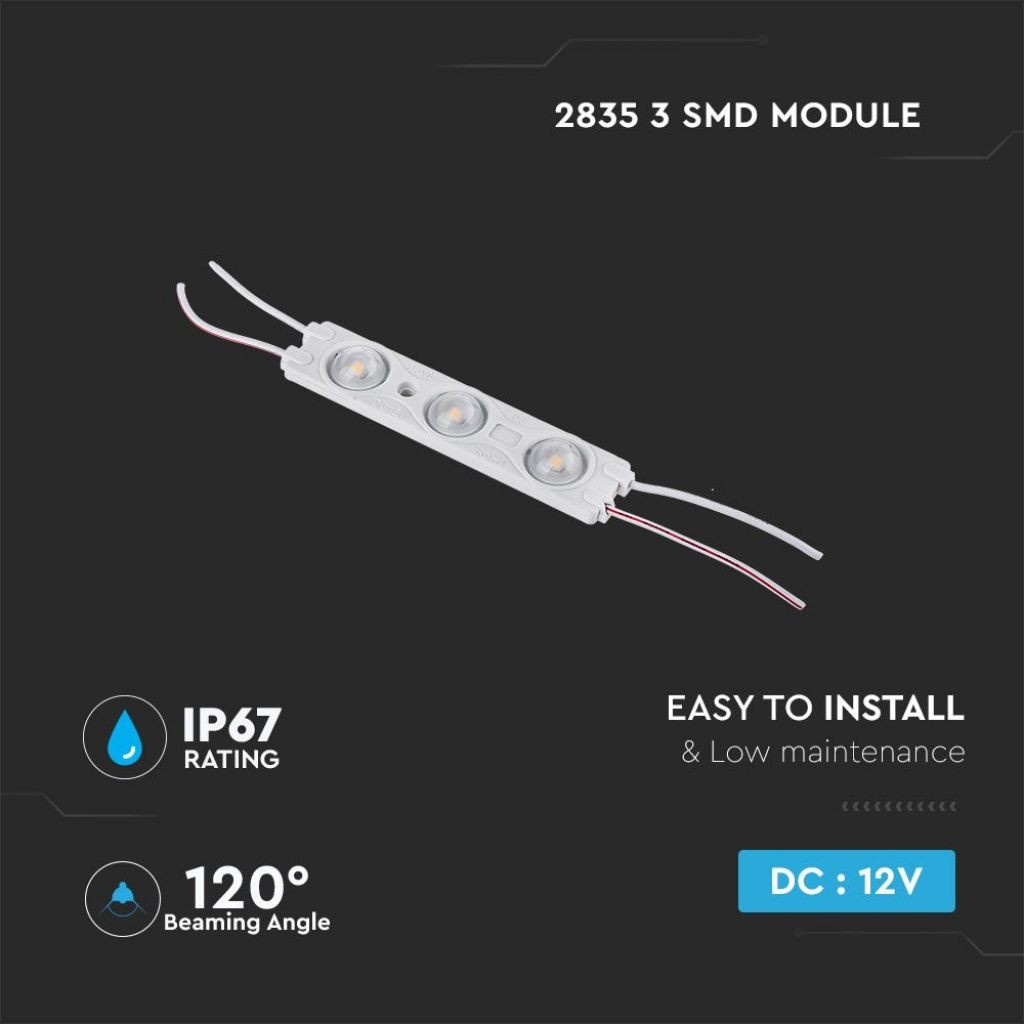 V-Tac VT-28356 modulo monocolore composto da 3 LED SMD 2835 con potenza totale di 1,5W e flusso luminoso complessivo fino a 150 lm. Ad alta luminosità e realizzato in ABS e alluminio, ha un fascio luminoso di 120° ed un rapporto fino a 100 lm/W. Grazie al suo grado di protezione IP67 è idoneo sia ad un uso domestico che industriale, ed è impiegabile anche nell’illuminazione architettonica di interni ed esterni. Date le ridotte dimensioni, è inoltre possibile utilizzarlo per insegne pubblicitarie o di segnalazione di qualsiasi misura e spessore. Il fascio luminoso diffuso consente una distribuzione omogenea della luce, mentre il biadesivo applicato sul retro rende il modulo di facile installazione. Il collegamento tramite cavi a saldare permette di alimentare tutti i moduli da un’unica fonte. Per il funzionamento è necessario un alimentatore 12V a corrente diretta proporzionato all’assorbimento totale di potenza di tutti i moduli collegati.