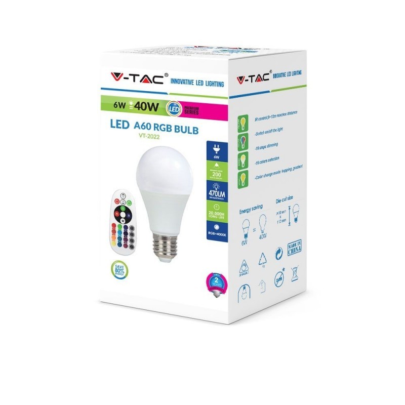 SKU 7121 VT-2022 V-TAC Lampadina LED E27 6W A60 RGB+W con Telecomando 3000K