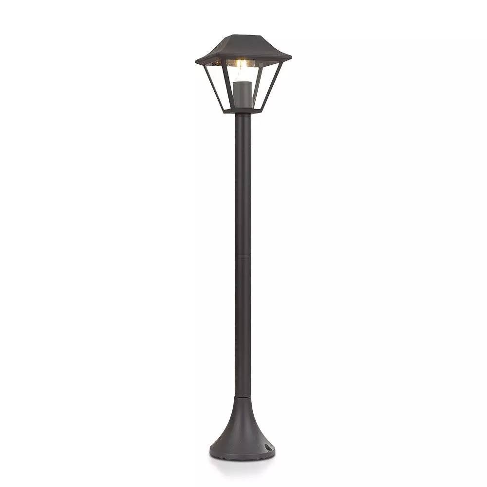 Lampione da giardino con portalampada per lampadine E27 (max 60W). Completo di palo e realizzato completamente in alluminio di colore nero opaco. Installabile a terra. Lanterna con copertura in vetro trasparente. Grado di protezione IP44. Dimensioni:175x950mm.