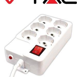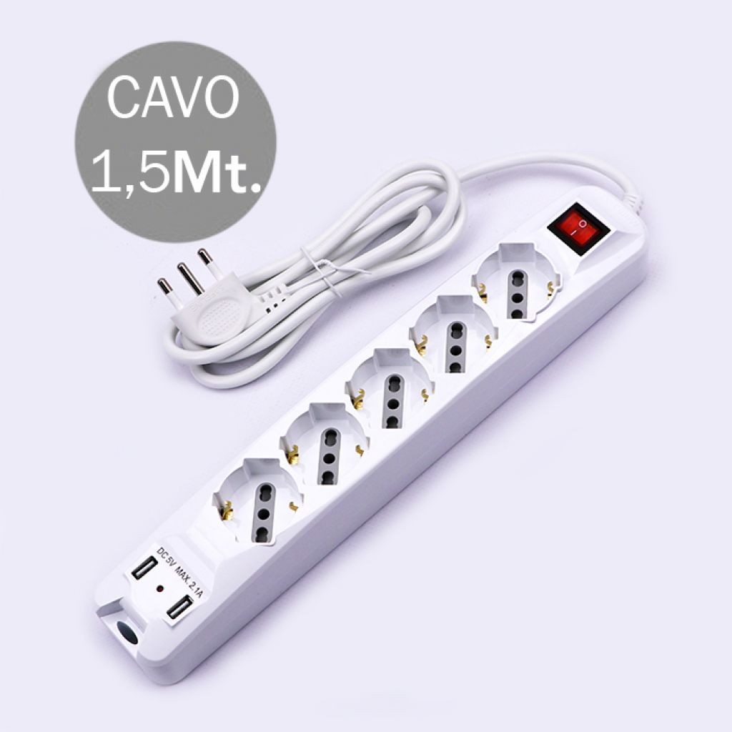 Multipresa da 5 posti Schuko + 10/16A 2P+T. Spina italiana 2P+T 16A. 2 prese USB. Carico massimo: 3500W. Interruttore luminoso. Dimensioni:335x45x55mm. Lunghezza cavo: 1,5 m.