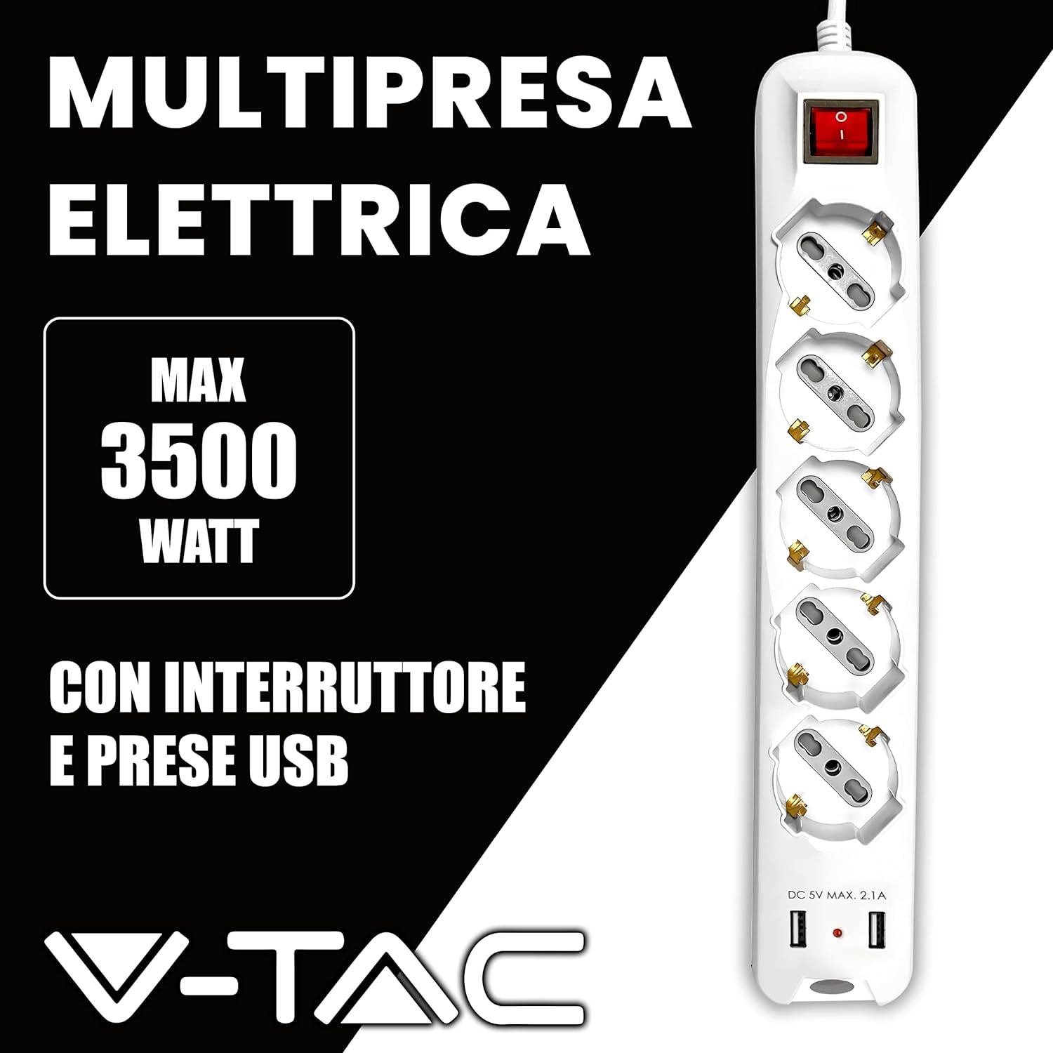 Multipresa V-Tac da 5 posti con 2 prese USB e interruttore luminoso. Realizzata in materiale plastico di colore bianco, ha spina di tipo italiano 2P+T 16A e 5 prese collegabili di tipo Schuko + 10/16A 2P+T. Inoltre nella parte superiore sono presenti 2 porte USB ognuna con DC 5V e 2,1A. In questo modo è possibile ricaricare i nostri dispositivi collegando direttamente il cavo USB, senza necessità di collegare la spina e occupare uno spazio della multipresa. Grazie all’interruttore ON/OFF illuminato e posto nella parte superiore, è possibile evitare inutili sprechi di energia togliendo corrente a tutte le spine connesse alla multipresa.