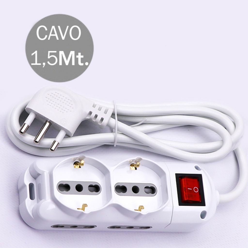 Multipresa salvaspazio da 2 posti Schuko + 10/16A 2P+T e 4 posti 10/16A 2P+T. Spina italiana 2P+T 16A. Carico massimo: 3500W. Interruttore luminoso. Dimensioni:150x45x47mm. Lunghezza cavo: 1,5 m.