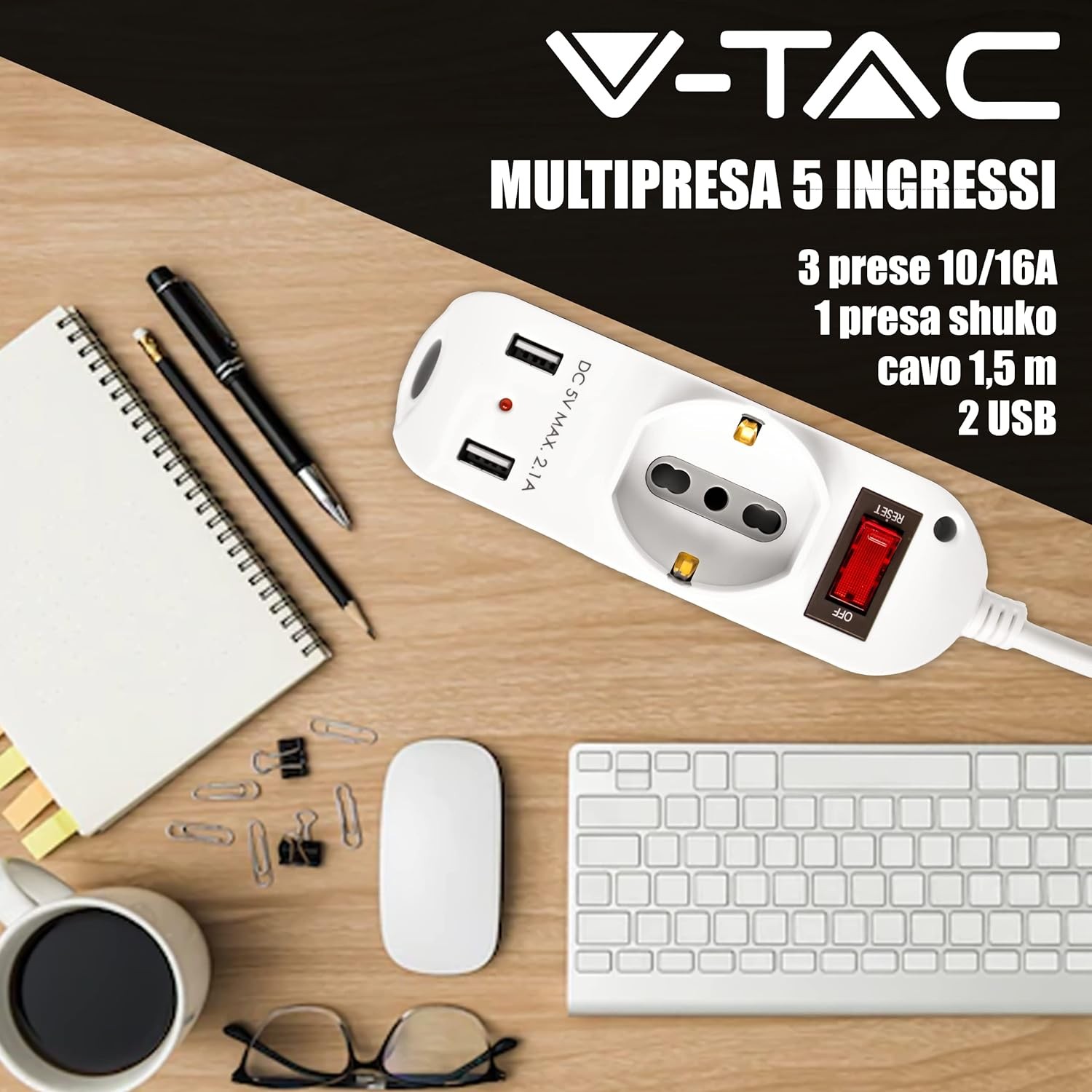 Multipresa V-Tac da 3 posti con 2 prese USB e interruttore luminoso. Realizzata in materiale plastico di colore bianco, ha spina di tipo italiano 2P+T 16A e 3 prese collegabili di tipo Schuko + 10/16A 2P+T. Inoltre nella parte superiore sono presenti 2 porte USB ognuna con DC 5V e 2,1A. In questo modo è possibile ricaricare i nostri dispositivi collegando direttamente il cavo USB, senza necessità di collegare la spina e occupare uno spazio della multipresa. L’interruttore ha la protezione da sovraccarichi ed è ripristinabile manualmente. Nel suo normale funzionamento, l’interruttore rimane nella posizione “RESET” con un LED che ne indica il funzionamento, mentre per spegnere tutti i dispositivi attaccati, basta premere il pulsante nella posizione OFF. Nel caso in cui intervenga la protezione, la multipresa automaticamente stacca la corrente e il pulsante si posiziona su OFF. Basta a questo punto scollegare tutti i dispositivi che hanno provocato il sovraccarico e riportare il pulsante nella posizione RESET.