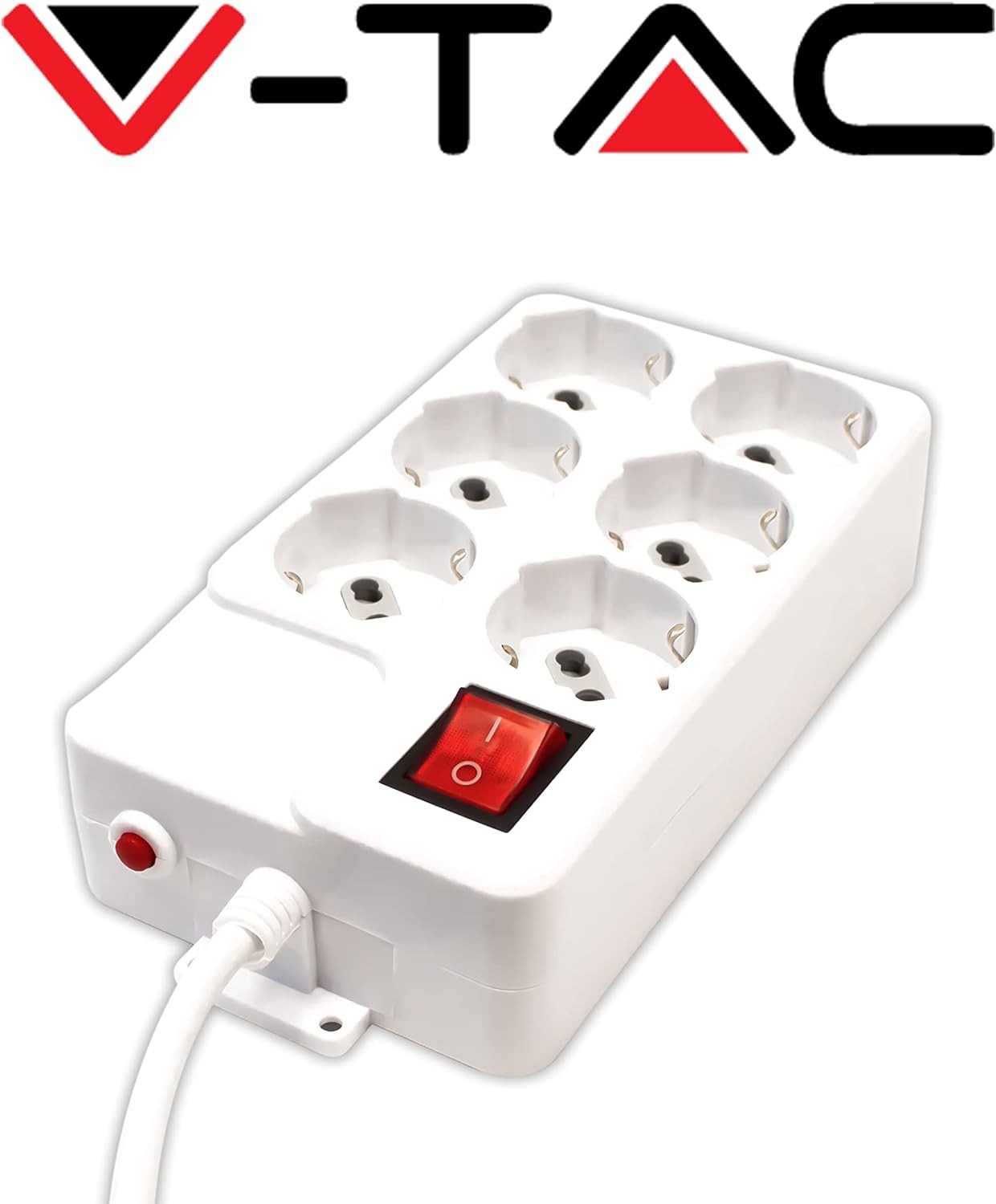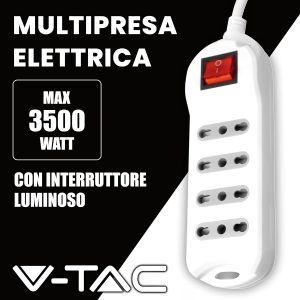 Multipresa V-Tac da 6 posti con interruttore luminoso. Realizzata in materiale plastico di colore bianco, ha spina di tipo italiano 2P+T 16A e 6 prese collegabili di tipo Schuko + 10/16A 2P+T. Grazie all’interruttore ON/OFF illuminato e posto nella parte superiore, è possibile evitare inutili sprechi di energia togliendo corrente a tutte le spine connesse alla multipresa. Dotato inoltre di di protezione termica ripristinabile, protegge la multipresa e gli utilizzatori connessi dal pericolo d’incendio, infatti in caso di temperatura troppo elevata il disgiuntore entra in azione togliendo l’alimentazione. La protezione è ripristinabile agendo sul bottone dedicato.
