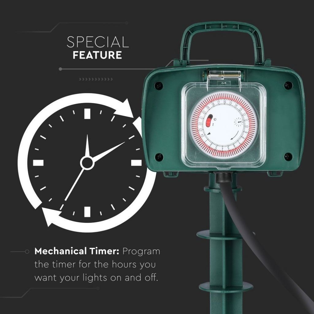 SKU 8811 VT-1112-3 V-TAC Presa da Giardino con Cavo 3mt 2 Prese 16A con Copertura e un Timer Meccanico sul Retro Colore Verde