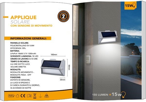 SKU YH0408-PIR-F applique solare 15W LUCE BIANCA 6500